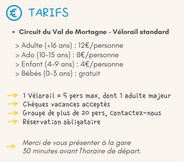 Le tarif s’entend par vélorail. Pour rappel, un Vélorail peut accueillir au maximum 4 adultes ou 3 adultes et 2 enfants.